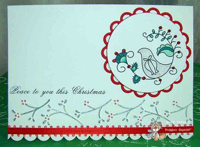 I colored the image in PSE. :0) I added some 3D Glitter White paint to the bird (if you enlarge the photo it's more visible). My card stock is actually white, too, but I had a tough time with the photo today - it's looking a little blue-ish, green-ish to me, here. :0( I added some Stickles to the berries. I layered the image on a Nestie, and scalloped the card edge with an EK Success punch. The embossing was done with my Cuttlebug "Just My Type" border folder. I added some glitter gel pen to the embossed image. I printed the sentiment on my card stock before folding my card base, to make it a single layer. I added some red frilly ribbon to finish it off! :0)